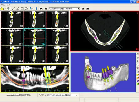 ガイデッドサージェリーとは、インプラント治療の精度・安全性を高める3Dコンピューターシミュレーションシステムです。CT撮影により得たデータをもとに、インプラントを埋入する骨の状態を立体的に把握でき、コンピュータ上で手術のシミュレーションを行うことができます。