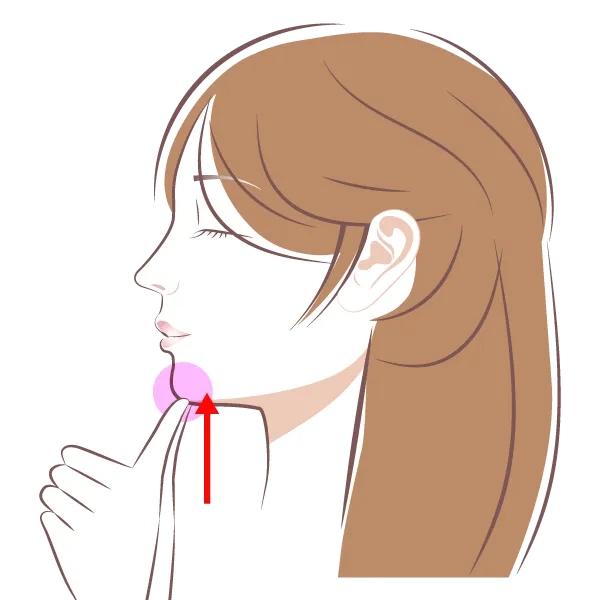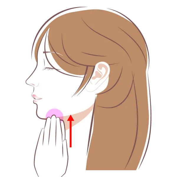 下顎の骨の柔らかい内側の部分に指先を当てて、耳の下から顎の下までを軽く押し上げます。